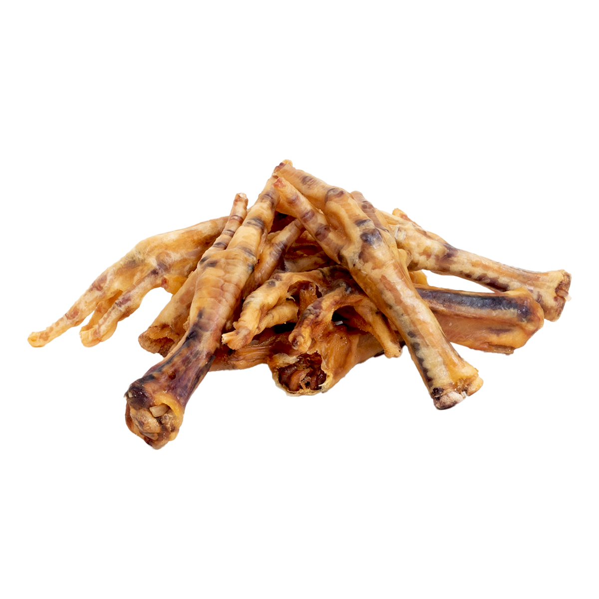 Kuřecí tlapky pro psy jsou přírodní pamlsek vyrobený procesem sušení a uzení bez použití chemických konzervantů. Každá tlapka je ručně vyrobená, což zaručuje nejvyšší kvalitu a bezpečnost. Tento produkt obsahuje pouze 100% sušené kuřecí tlapky, bez přidání umělých aromat, barviv nebo obilovin.
