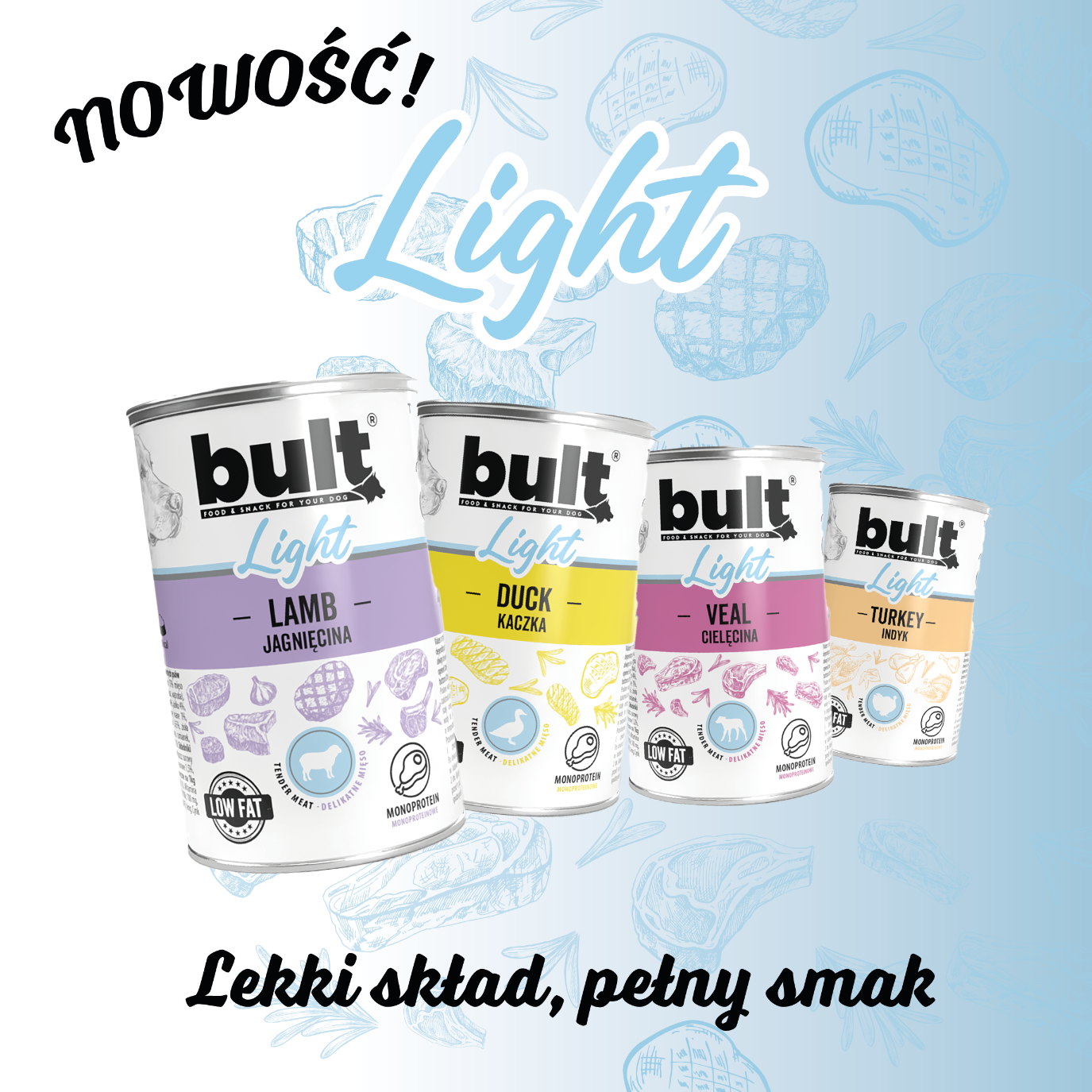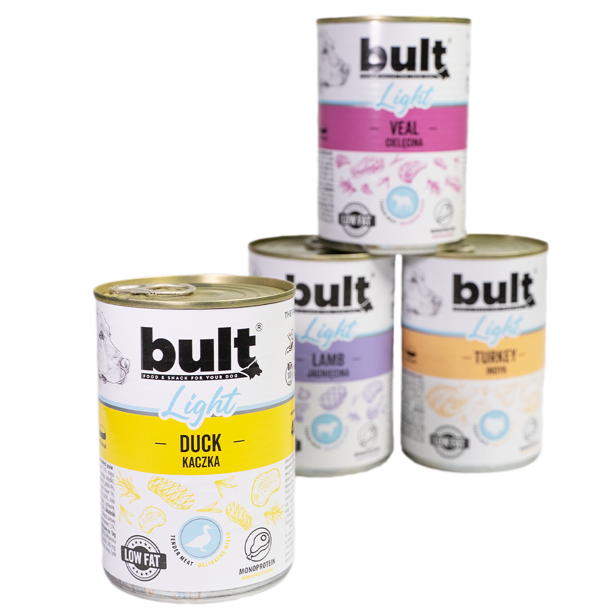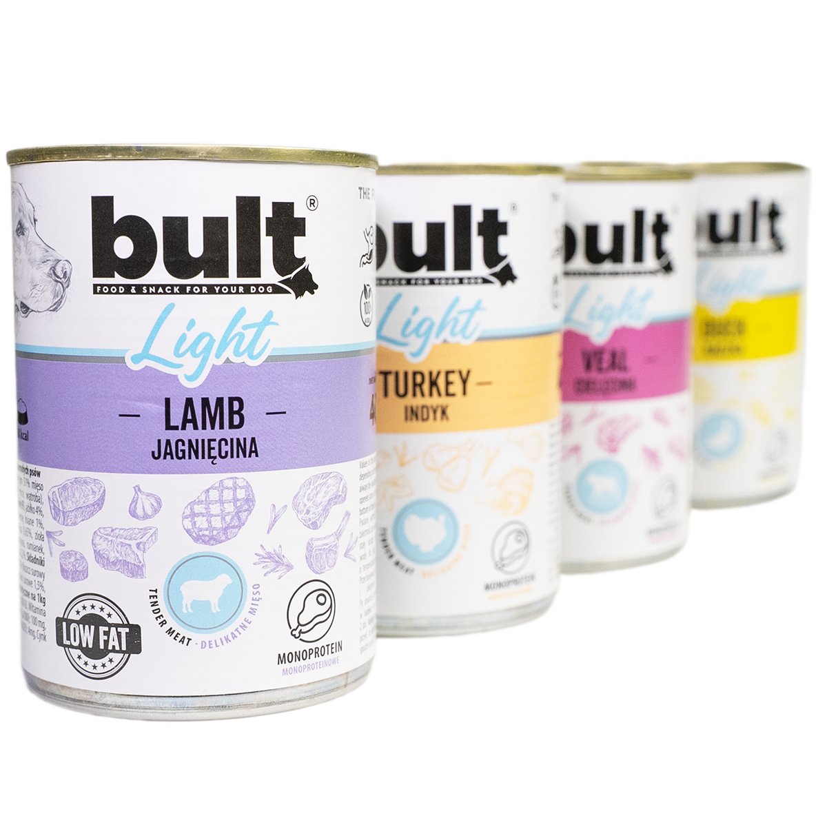 BULT Light Mix Smaków to zestaw lekkiej karmy mokrej dla psów dorosłych, które wymagają kontroli masy ciała, ale jednocześnie potrzebują zróżnicowanej i smakowitej diety. W zestawie znajdują się cztery warianty smakowe: indyk, jagnięcina, cielęcina oraz kaczka.