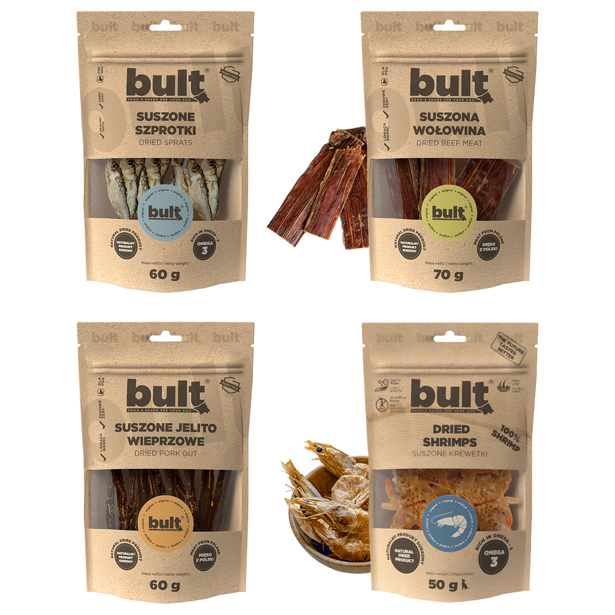 Wyjątkowy zestaw dla psów, które kochają intensywne smaki mięsa i ryb. Kompozycja czterech naturalnych gryzaków marki BULT łączy wysoką zawartość białka, różnorodność tekstur oraz pełnię aromatu.