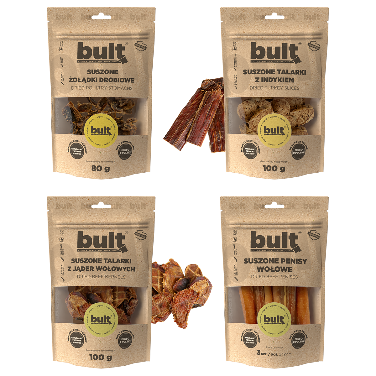 Wyjątkowy zestaw dla psów, które kochają intensywny smak mięsa i długie żucie. Kompozycja czterech naturalnych gryzaków marki BULT łączy wysoką zawartość białka, różnorodność tekstur oraz pełnię aromatu.