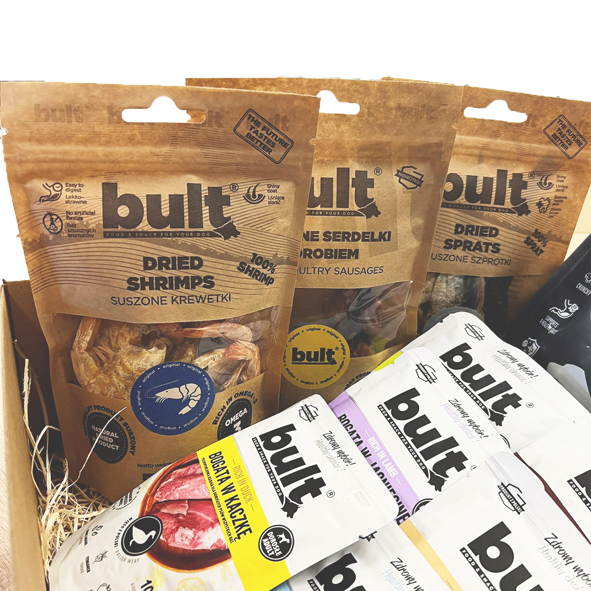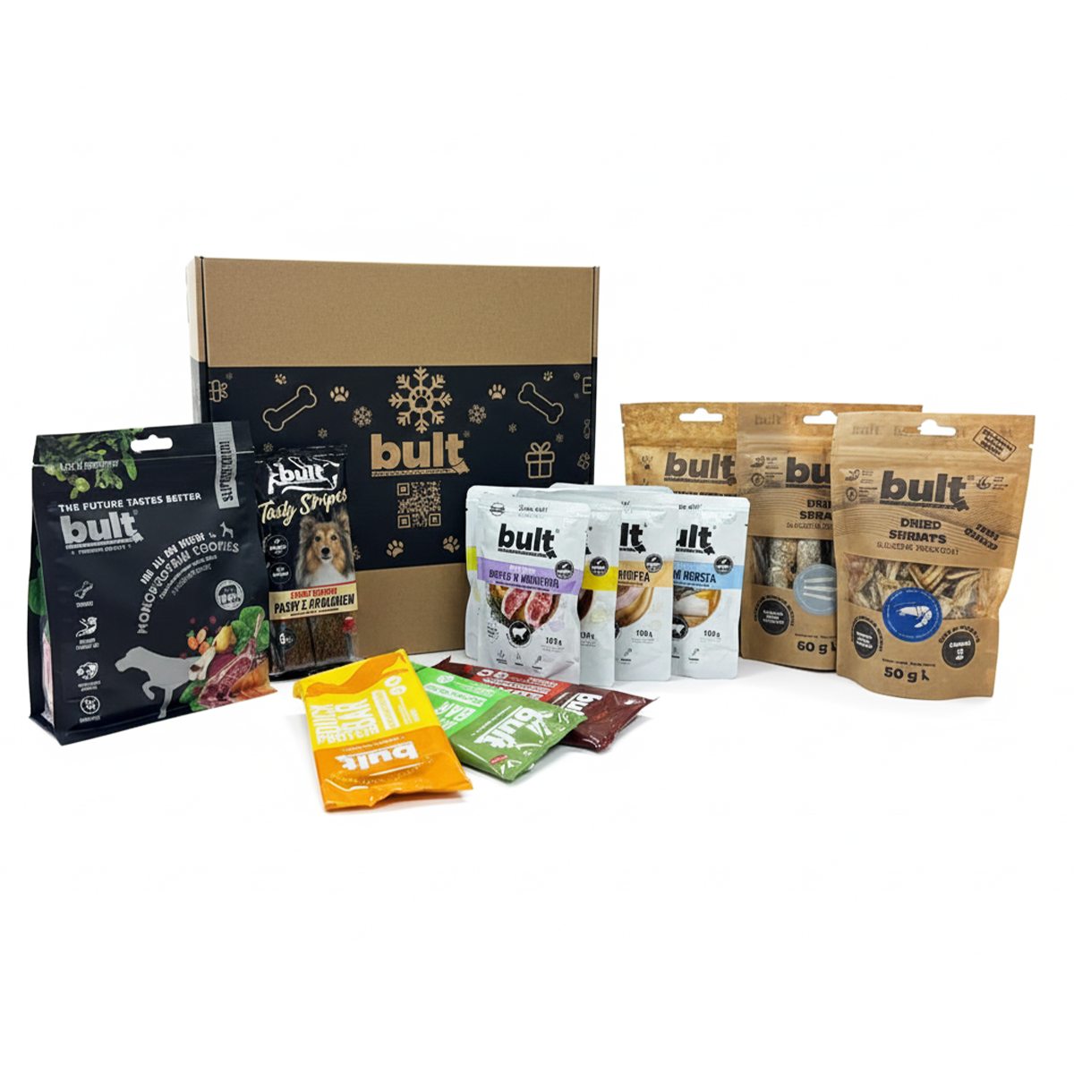 Saszetka mielonka BULT bogata w dorsza: Mięso i produkty pochodzenia zwierzęcego 75%(w tym wieprzowina, wołowina i mięso oraz produkty pochodzenia z dorsza 20%), ryż, marchew 2%, siemię lniane 0,5%, tymianek