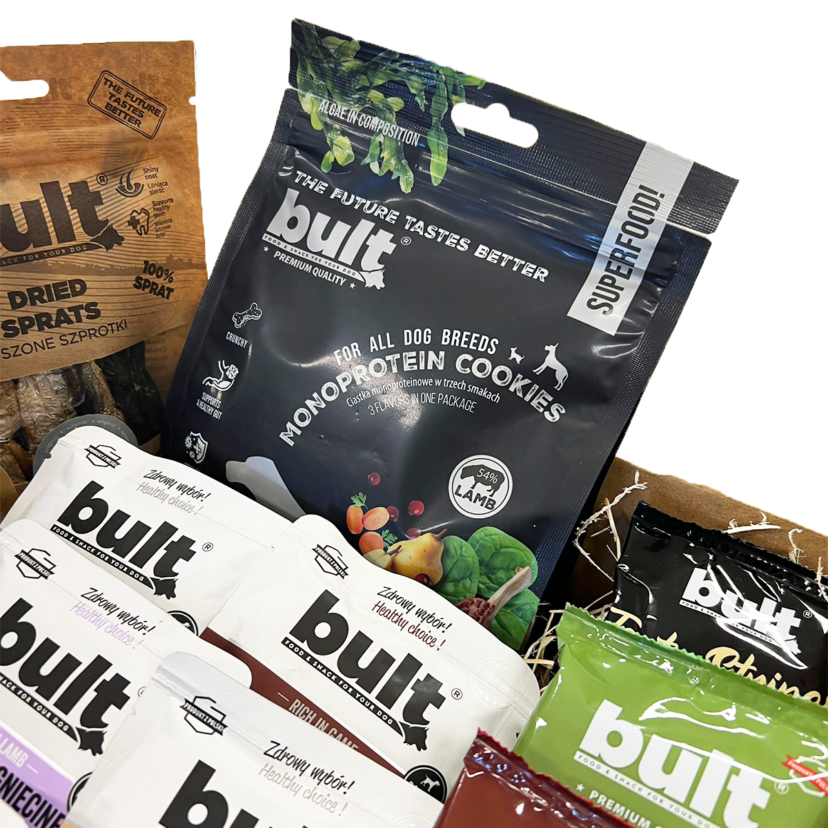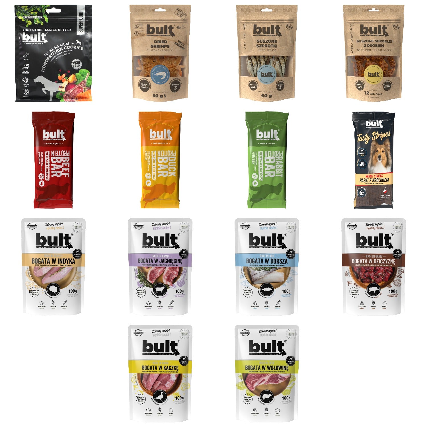Saszetka mielonka BULT bogata w jagnięcinę: Mięso i produkty pochodzenia zwierzęcego 75%(w tym wieprzowina, wołowina i mięso oraz produkty pochodzenia z jagnięciny 20%), ryż, dynia 2%, siemię lniane 0,5%, tymianek