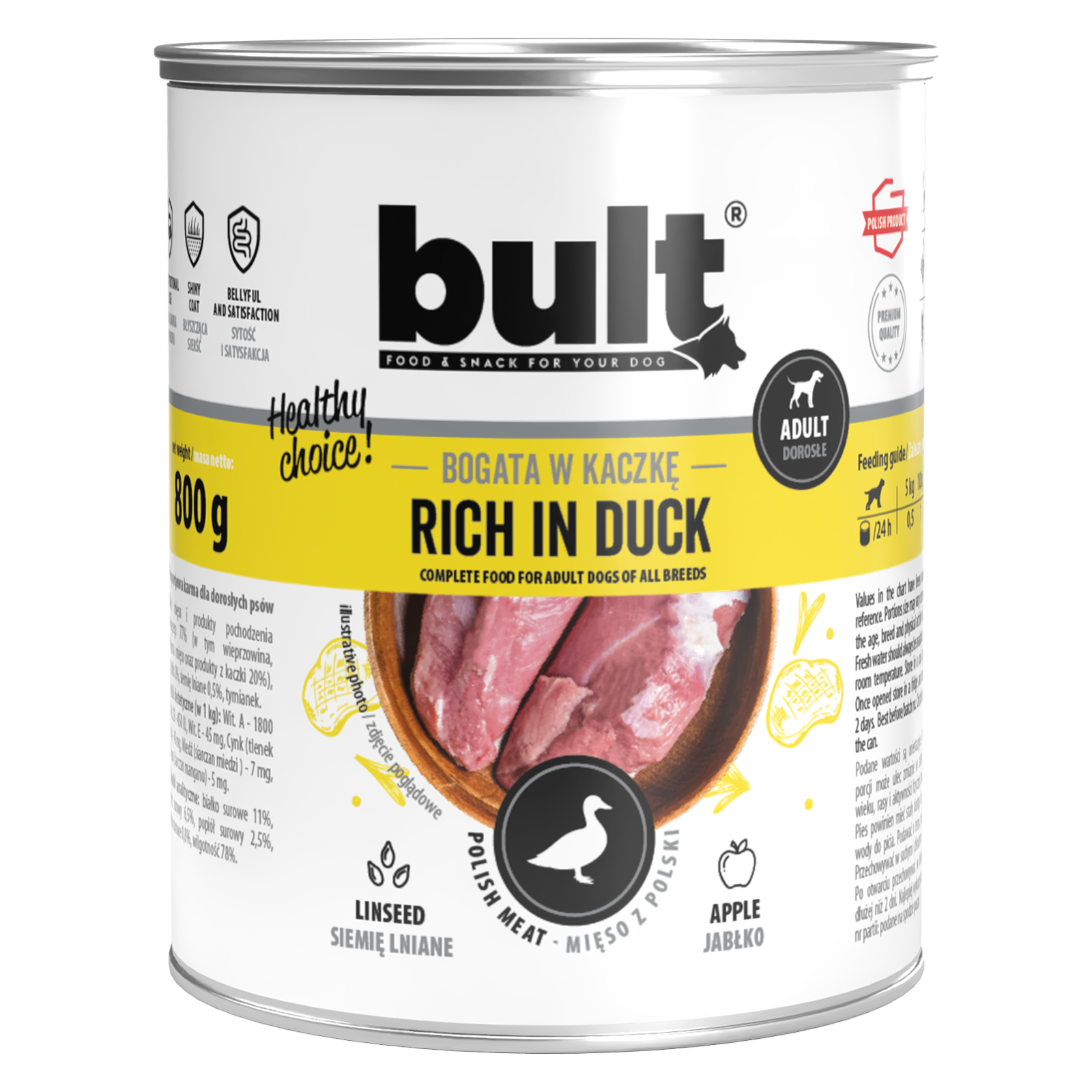 BULT to gwarancja jakości, smaku i prostoty. Puszka z kaczką może być podawana codziennie jako główny posiłek lub jako urozmaicenie diety. Sprawdzi się zarówno w domu, jak i w podróży – zawsze wtedy, gdy chcesz zadbać o zdrowie i dobre samopoczucie swojego psa.