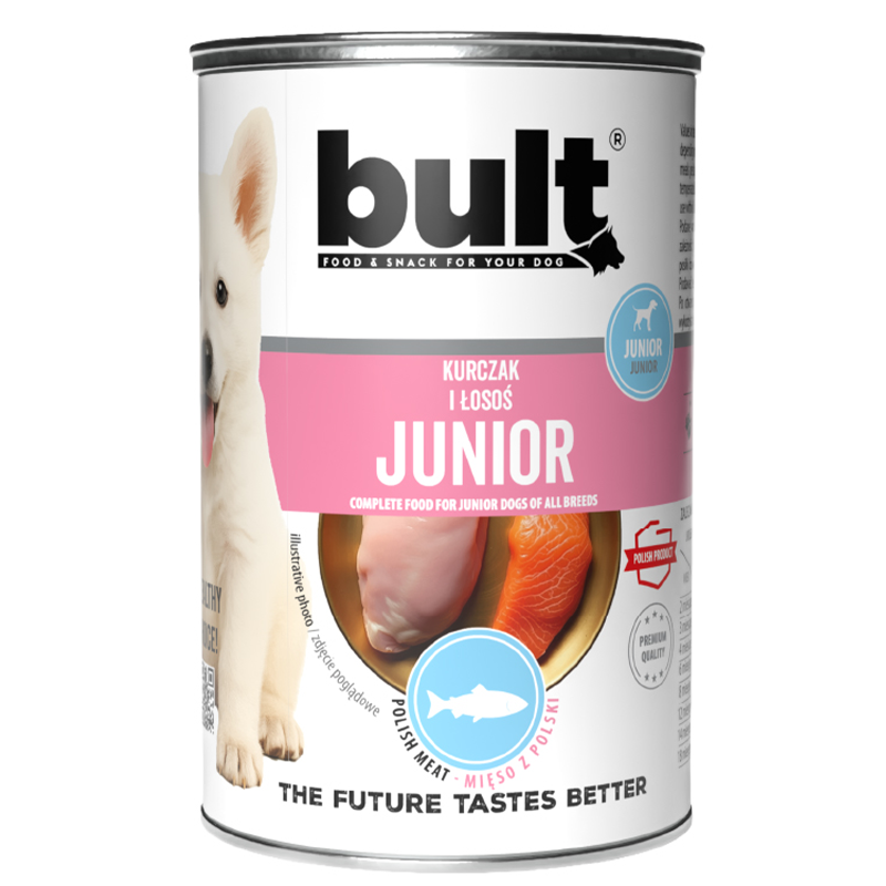 Bult Junior to mokra karma premium gwarantująca Twojemu psu dostarczenie wszystkich niezbędnych składników dla zdrowego dorastania. Dostępność produktu w dwóch smakach - kurczak z wołowiną oraz kurczak i łosoś - w których podstawowym  produktem jest kurczak, umożliwia dopasowanie do potrzeb Twojego szczenięcia.