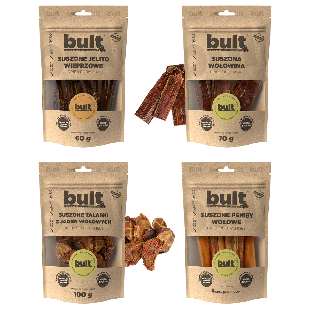 Mięsna uczta dla prawdziwego smakosza! Zestaw BULT WOŁOWO-WIEPRZOWY MIX PREMIUM to kompozycja czterech intensywnie mięsnych gryzaków, które zaspokoją naturalną potrzebę żucia i dostarczą wartościowego białka.