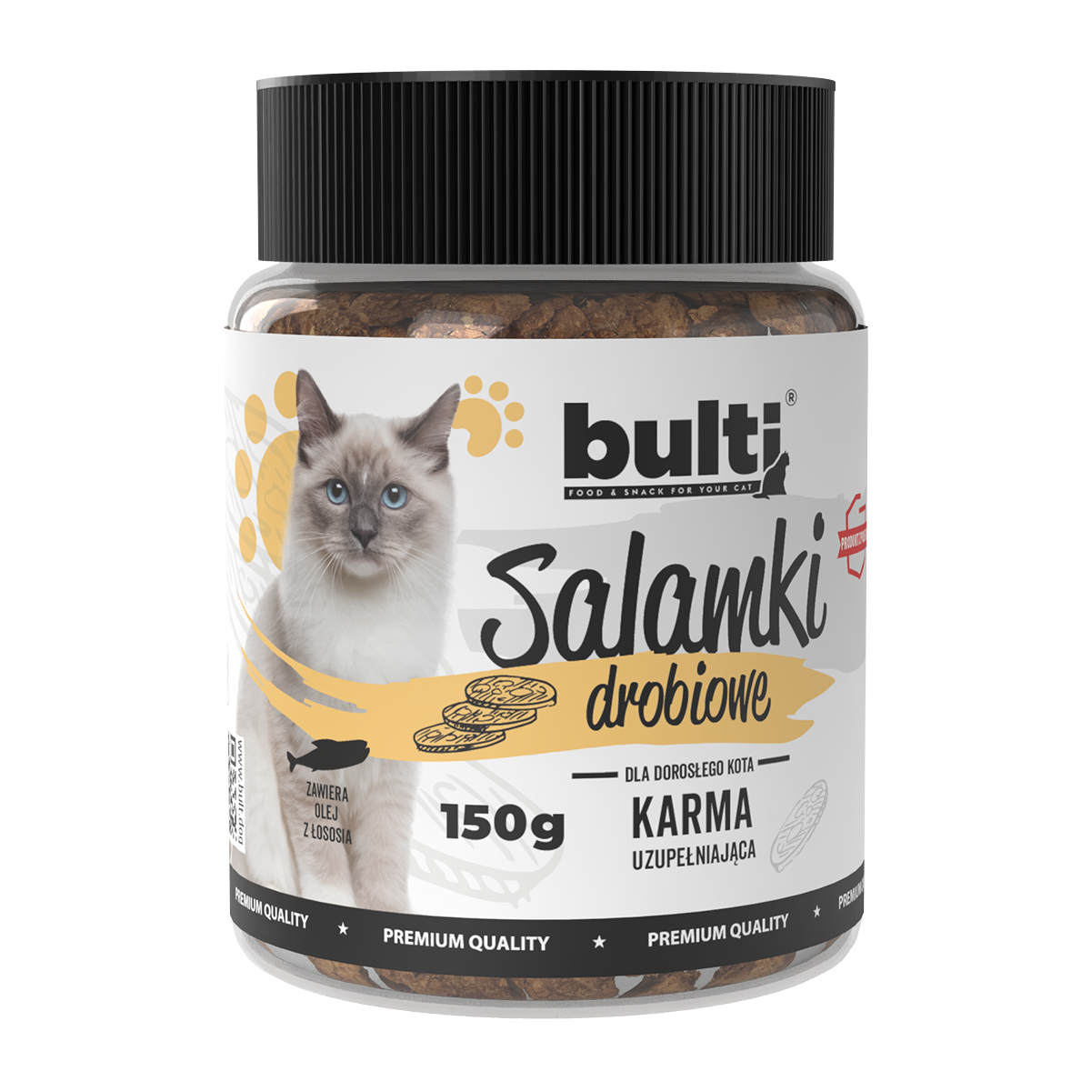 Salamki BULTI to idealna przekąska między posiłkami, nagroda po zabawie czy sposób na budowanie relacji z kotem. Dzięki praktycznemu opakowaniu 150g możesz mieć je zawsze przy sobie – w domu, na spacerze czy w podróży. To smaczki, które łączą przyjemność z troską o zdrowie.