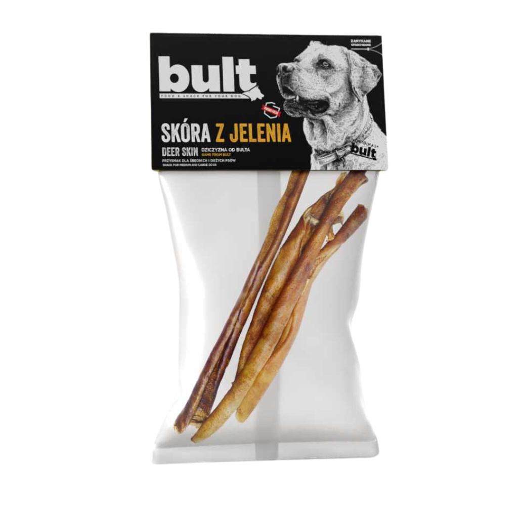 Skóra z jelenia to jeden z najbardziej cenionych gryzaków w ofercie BULT – nie tylko ze względu na smak, ale przede wszystkim na jakość i bezpieczeństwo. Pozyskiwana ze sprawdzonych źródeł, suszona w sposób redukujący do zera użycie chemicznych środków konserwujących, a następnie poddana ręcznej obróbce – to produkt, który spełnia najwyższe standardy.